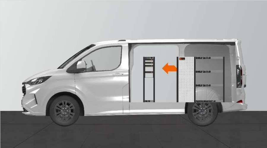 Har du behov for å maksimere din Ford Custom & VW Transporter L1 med en ekstra innredning? Med denne innredning kan du beholde bredden i bilen, siden innredningen er 260 mm dyp. Serviceinnredningen har 4 skuffer på kulelagerskinner i ulike størrelser for ulike oppbevaringsmuligheter. Disse kan kompletteres med innsatssett eller skuffeinnsatser for å skape orden og oversikt i et mindre sortiment. Hyllerommet bak skuffeseksjonen kompletteres ofte med modulbokser. Fordelt lastvekt i skuffene på kulelagerskinner er 35 kg/stk. Skuffenes innvendige mål er (mm) B 163, D 387, H 60 og H 130.