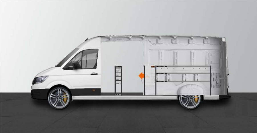 Har du behov for å maksimere din MAN TGE & Volkswagen Crafter L4 med en ekstra innredning? Med denne innredning kan du beholde bredden i bilen, siden innredningen er 260 mm dyp. Serviceinnredningen har 3 skuffer på kulelagerskinner i ulike størrelser for ulike oppbevaringsmuligheter. Disse kan kompletteres med innsatssett eller skuffeinnsatser for å skape orden og oversikt i et mindre sortiment. Hyllerommet bak skuffeseksjonen kompletteres ofte med modulbokser. Fordelt lastvekt i skuffene på kulelagerskinner er 35 kg/stk. Skuffenes innvendige mål er (mm) B 163, D 387, H 130.