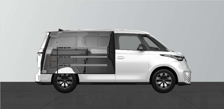 En bilinnredning for deg som vil bevare bredden i din VW ID Buzz L1. Innredningen er bare 262,5 mm dyp og gir gode oppbevaringsmuligheter for et mindre sortiment, som pakker med skruer og småprodukter for vaktmestere, elektrikere og VVS-montører. Det er mulig å komplettere innredningen med våre smarte modulbokser. Det er også populært å komplettere gavlen med vår smartboks for å maksimere oppbevaringsplassen.