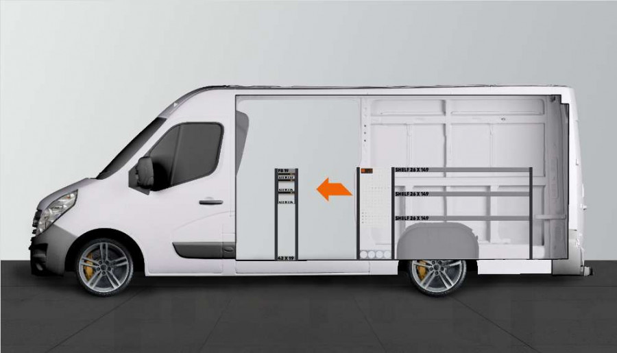 Har du behov for å maksimere din Opel Movano, Renault Master & Nissan NV400 L3 med en ekstra innredning? Med denne innredning kan du beholde bredden i bilen, siden innredningen er 260 mm dyp. Serviceinnredningen har 3 skuffer på kulelagerskinner i ulike størrelser for ulike oppbevaringsmuligheter. Disse kan kompletteres med innsatssett eller skuffeinnsatser for å skape orden og oversikt i et mindre sortiment. Hyllerommet bak skuffeseksjonen kompletteres ofte med modulbokser. Fordelt lastvekt i skuffene på kulelagerskinner er 35 kg/stk. Skuffenes innvendige mål er (mm) B 163, D 387, H 60 og H 130.