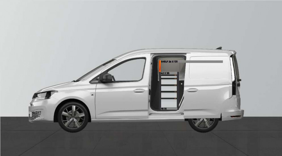 Dette er et av de mest populære systemene for VW Caddy Cargo & Ford Connect L1 med sidedør på siden av innredningen. Innredningen gir gode oppbevaringsmuligheter for både verktøykofferter, maskiner og et mindre sortiment. Du får en skuffeseksjon med 5 stk. skuffer i ulike størrelser, slik at hver ting har sin plass. Bak skuffene er det en verktøytavle for ekstra opphengsmuligheter i bilen. Skuffene på kulelagerskinner kompletteres ofte med våre nye skuffeinnsatser og avdelere for å skape best mulig oversikt. Det er også populært å komplettere gavlen med vår smartboks for å maksimere oppbevaringsplassen.