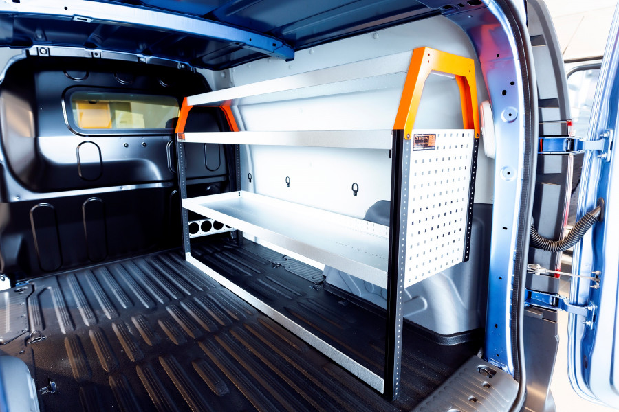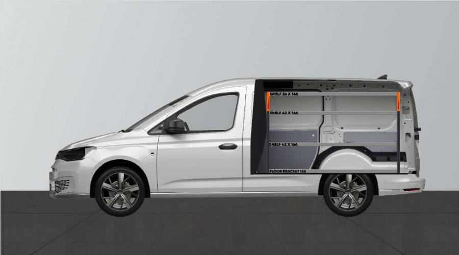 En bilinnredning til din VW Caddy Cargo & Ford Connect L2 som gir gode oppbevaringsalternativer for både verktøyvesker og maskiner og et mindre sortiment. Innredningens hyller med en dybde på 420 mm gjør at de fleste verktøykofferter på markedet passer perfekt. Den øverste hyllen på 262,5 mm kompletteres ofte med våre modulbokser for å gi plass til et mindre sortiment. Husk å utnytte verktøytavlen på gavlen.