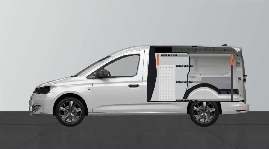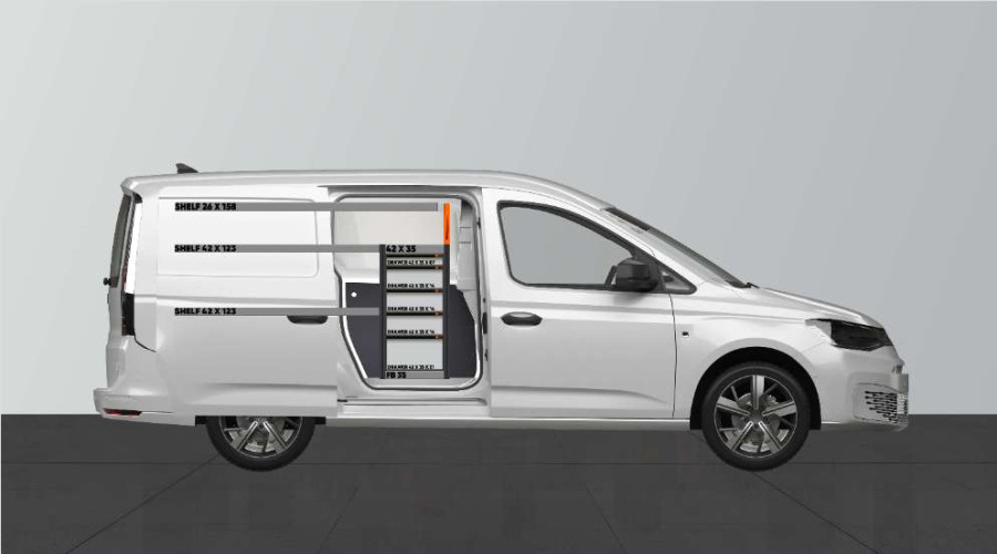 Dette er et av de mest populære systemene for VW Caddy Cargo & Ford Connect L2 med sidedør på siden av innredningen. Innredningen gir gode oppbevaringsmuligheter for både verktøykofferter, maskiner og et mindre sortiment. Du får en skuffeseksjon med 5 stk. skuffer i ulike størrelser, slik at hver ting har sin plass. Bak skuffene er det en verktøytavle for ekstra opphengsmuligheter i bilen. Skuffene på kulelagerskinner kompletteres ofte med våre nye skuffeinnsatser og avdelere for å skape best mulig oversikt. Det er også populært å komplettere gavlen med vår smartboks for å maksimere oppbevaringsplassen.