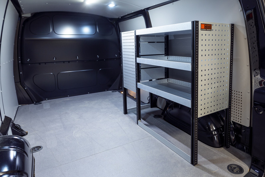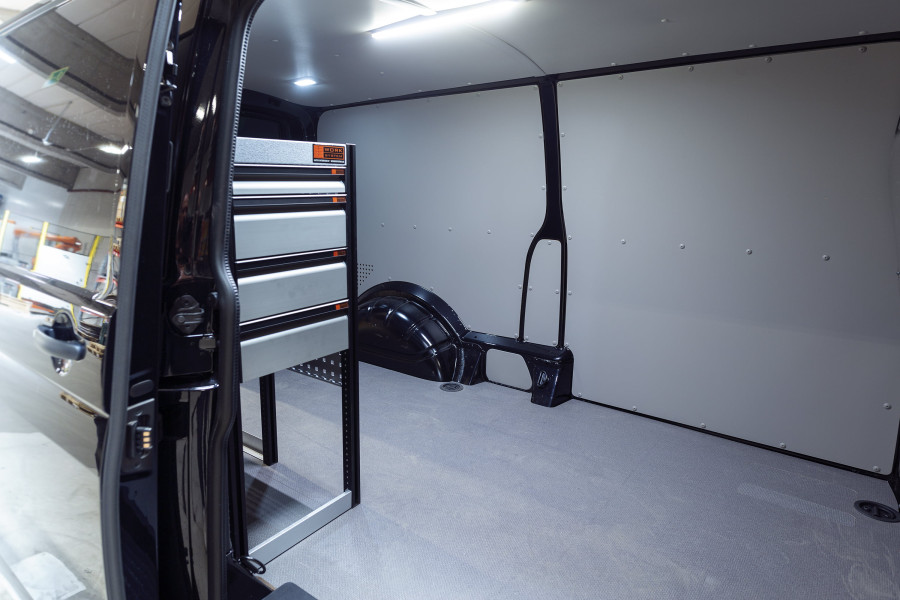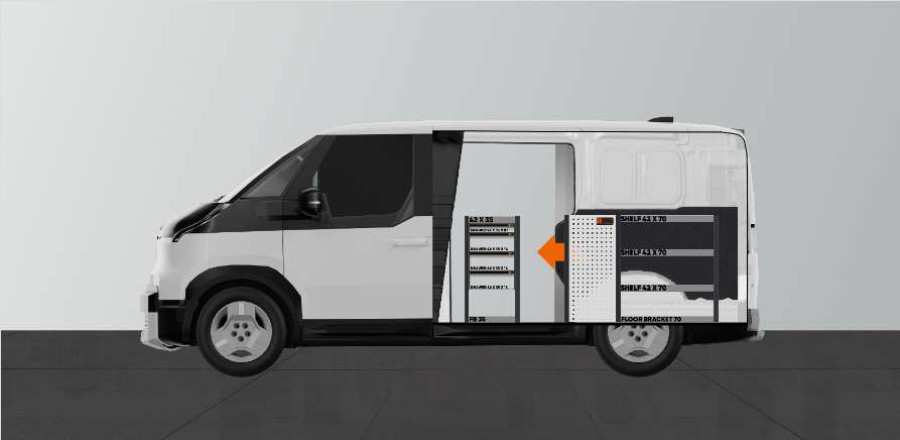 Dette er en av de mest populære innredningene til Kia PV5 L2H1. Innredningen gir varierende oppbevaringsmuligheter ettersom skuffene på kulelagerskinnene gir smidig tilgang via sidedøren, samtidig som skuffene kan trekkes ut i kjøreretningen for å få god oversikt. Disse kan kompletteres med skuffeinndelere for å maksimere strukturen i et mindre sortiment. Mange dype hyller gir også gode oppbevaringsmuligheter for både verktøykofferter og mindre maskiner. Fordelt lastvekt i skuffene på kulelagerskinner er 35 kg/stk. Skuffenes innvendige mål er (mm) B 308, D 387, H 60 og H 130.