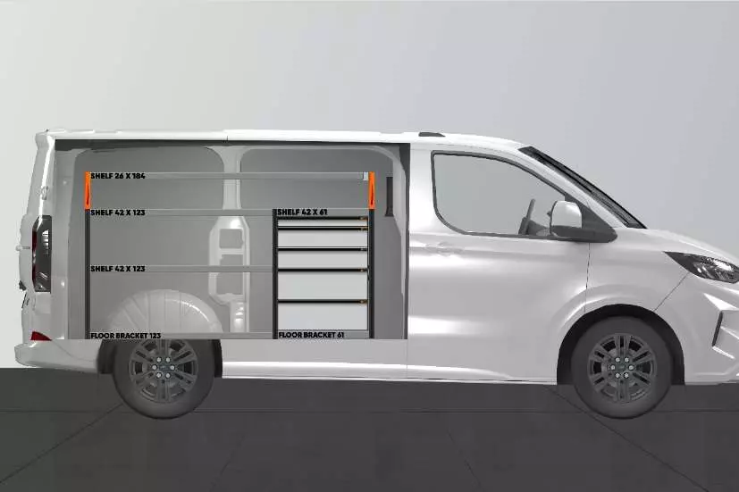 Dette er et av de mest populære systemene for Ford Custom & VW Transporter L1. Innredningen gir gode oppbevaringsmuligheter for både verktøykofferter, maskiner og et mindre sortiment. Du får en skuffeseksjon med 5 skuffer i ulike størrelser, slik at hver ting har sin plass. Skuffene på kulelagerskinner kompletteres ofte med våre nye skuffeinnsatser og avdelere for å skape best mulig oversikt. Det er også populært å komplettere gavlen med våre smartbokser for å maksimere oppbevaringsplassen.