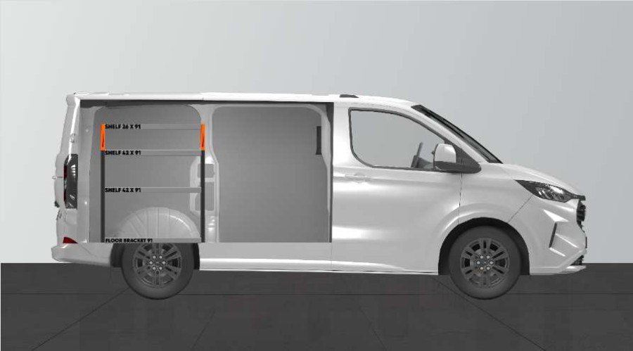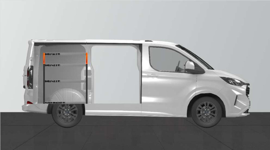 En kortere bilinnredning til din Ford Custom & VW Transporter L1, som gir gode oppbevaringsmuligheter for både verktøyvesker og maskiner og et mindre sortiment. Innredningen har hyller med en dybde på 420 mm, som gjør at de fleste verktøykofferter på markedet passer perfekt. Den øverste hyllen på 262,5 mm kompletteres ofte med våre modulbokser for separate plasser til et mindre sortiment. Innredningen passer til biler både med og uten sidedører. Ikke glem å utnytte verktøytavlen på gavlen.