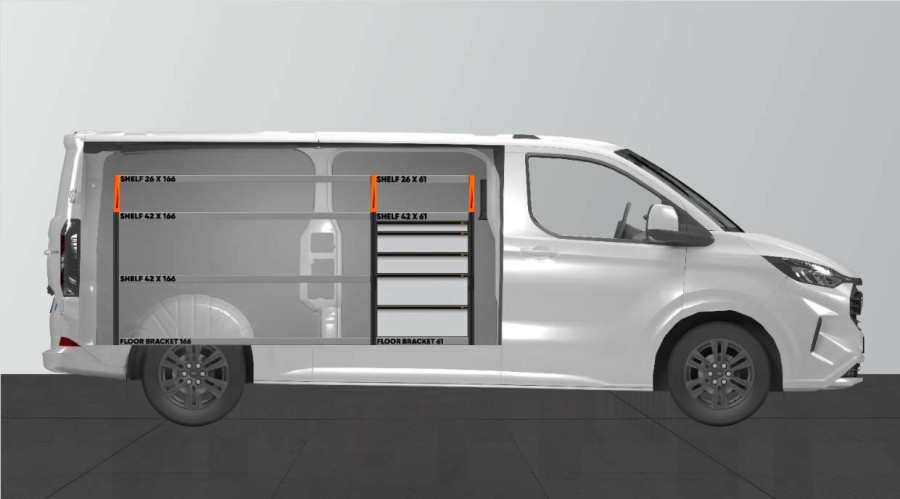 Dette er et av de mest populære systemene for Ford Custom & VW Transporter L2. Innredningen gir gode oppbevaringsmuligheter for både verktøykofferter, maskiner og et mindre sortiment. Du får en skuffeseksjon med 5 skuffer i ulike størrelser, slik at hver ting har sin plass. Skuffene på kulelagerskinner kompletteres ofte med våre nye skuffeinnsatser og avdelere for å skape best mulig oversikt. Det er også populært å komplettere gavlen med våre smartbokser for å maksimere oppbevaringsplassen.