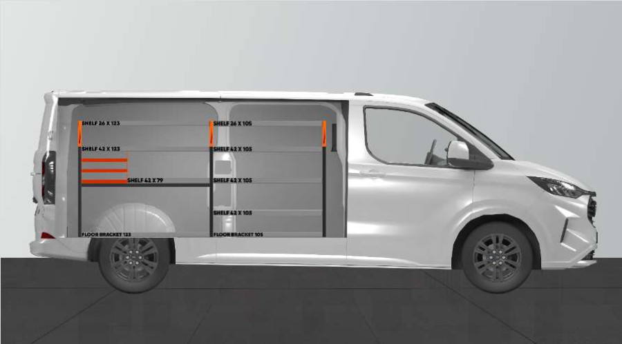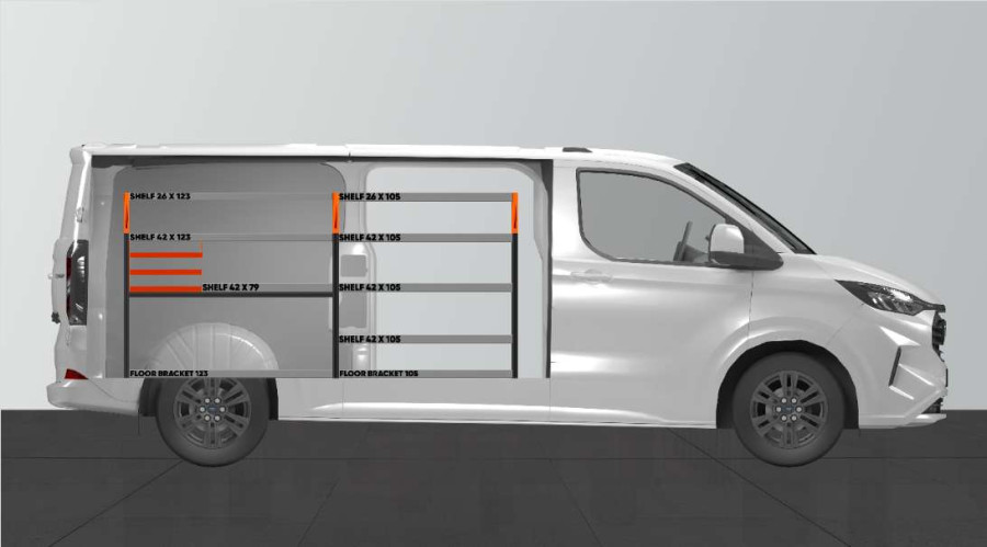 En populær innredning for deg som trenger gode oppbevaringsmuligheter til et mindre sortiment, verktøykofferter og maskiner. Denne serviceinnredningen inneholder 3 stk. sortimentholdere som er tilpasset markedets mest populære sortimentskuff, Racco Carrylight. Innredningen kan om ønskelig kompletteres med disse sortimentskuffene. Bilinnredningen passer perfekt til din Ford Custom & VW Transporter L2.