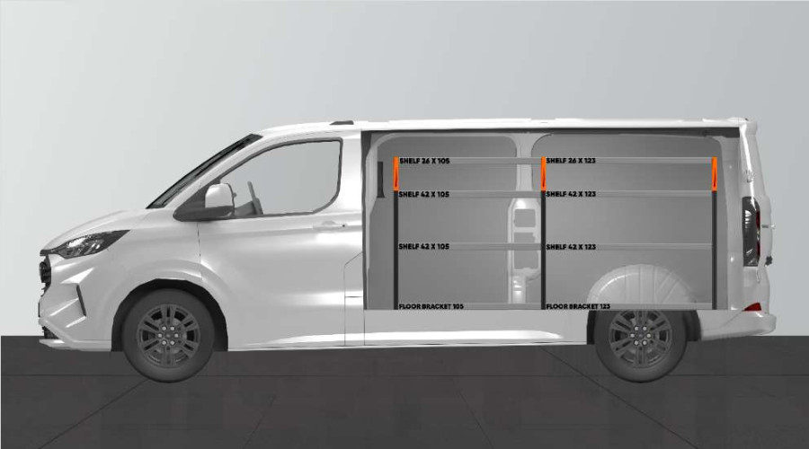 En bilinnredning til din Ford Custom & VW Transporter L2 som gir gode oppbevaringsalternativer for både verktøyvesker og maskiner og et mindre sortiment. Innredningens hyller med en dybde på 420 mm gjør at de fleste verktøykofferter på markedet passer perfekt. Den øverste hyllen på 262,5 mm kompletteres ofte med våre modulbokser for å gi plass til et mindre sortiment. Husk å utnytte verktøytavlen på gavlen.