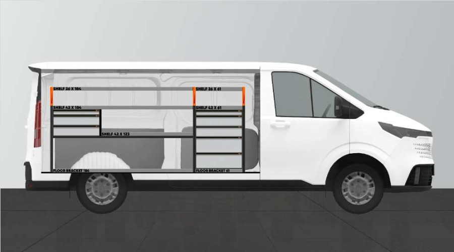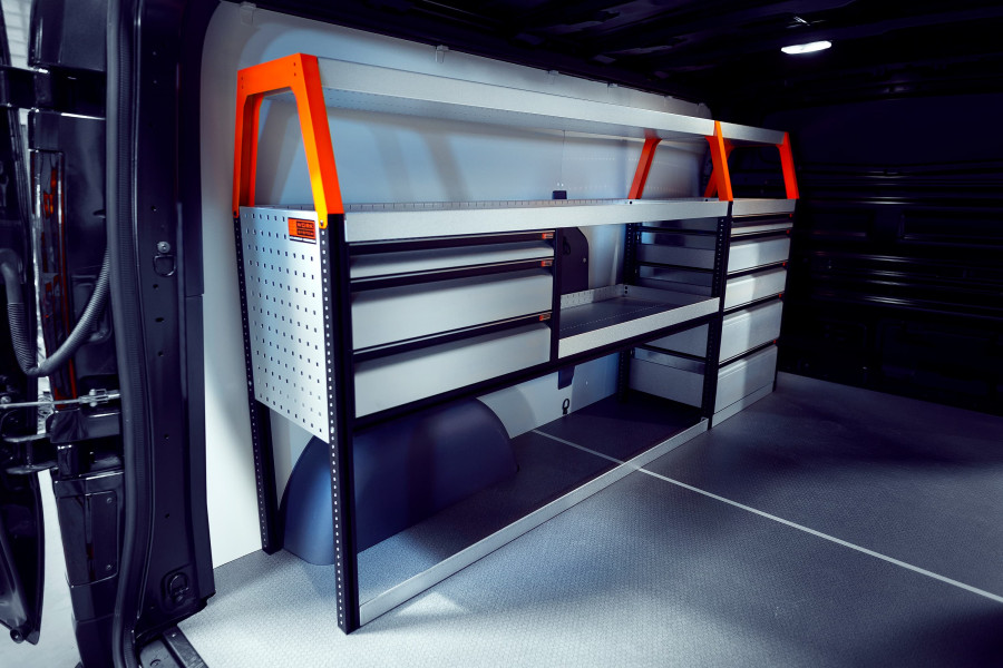 Denne innredningen til MAXUS E-DELIVER 7 L2 er for deg som trenger mye fleksibilitet i innredningen. Totalt får du 8 skuffer på kulelagerskinner. Innredningen gir gode oppbevaringsmuligheter for både verktøykofferter, maskiner og et mindre sortiment. Du får en skuffeseksjon med skuffer i ulike størrelser, slik at hver ting har sin plass. Skuffene på kulelagerskinner er populære å komplettere med våre skuffeinnsatser og avdelere for å skape best mulig oversikt i skuffene.