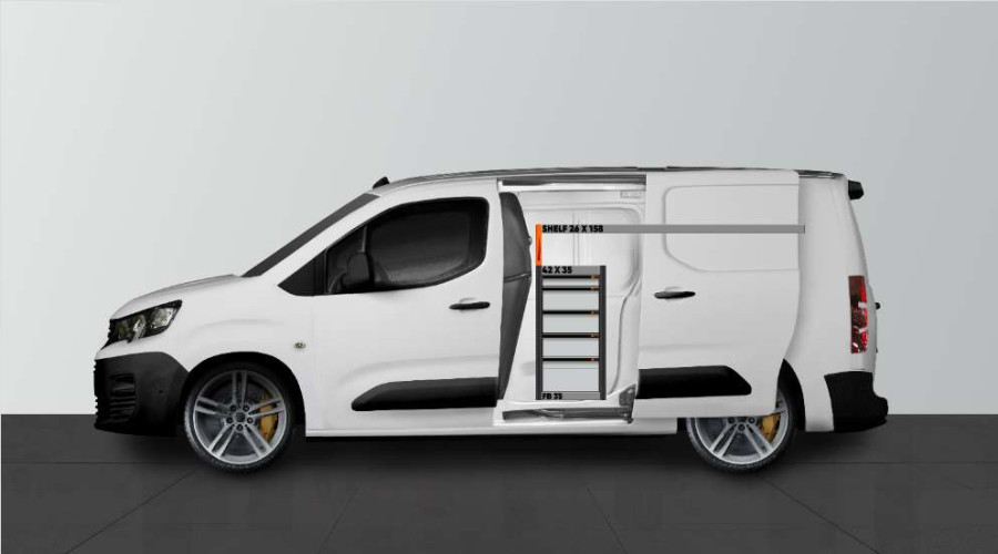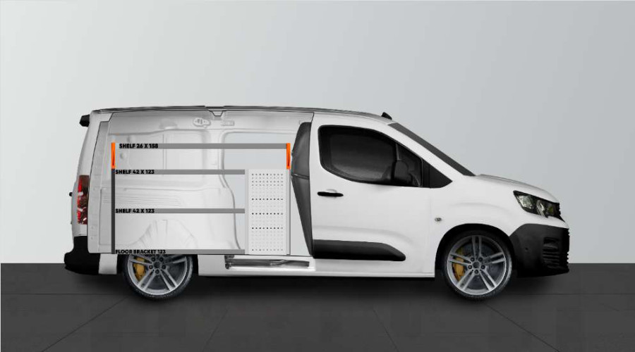 Dette er et av de mest populære systemene for Citroën Berlingo, Opel Combo, Fiat Doblo Toyota Proace City & Peugeot Partner L2med sidedør på siden av innredningen. Innredningen gir gode oppbevaringsmuligheter for både verktøykofferter, maskiner og et mindre sortiment. Du får en skuffeseksjon med 5 stk. skuffer i ulike størrelser, slik at hver ting har sin plass. Bak skuffene er det en verktøytavle for ekstra opphengsmuligheter i bilen. Skuffene på kulelagerskinner kompletteres ofte med våre nye skuffeinnsatser og avdelere for å skape best mulig oversikt. Det er også populært å komplettere gavlen med vår smartboks for å maksimere oppbevaringsplassen.
