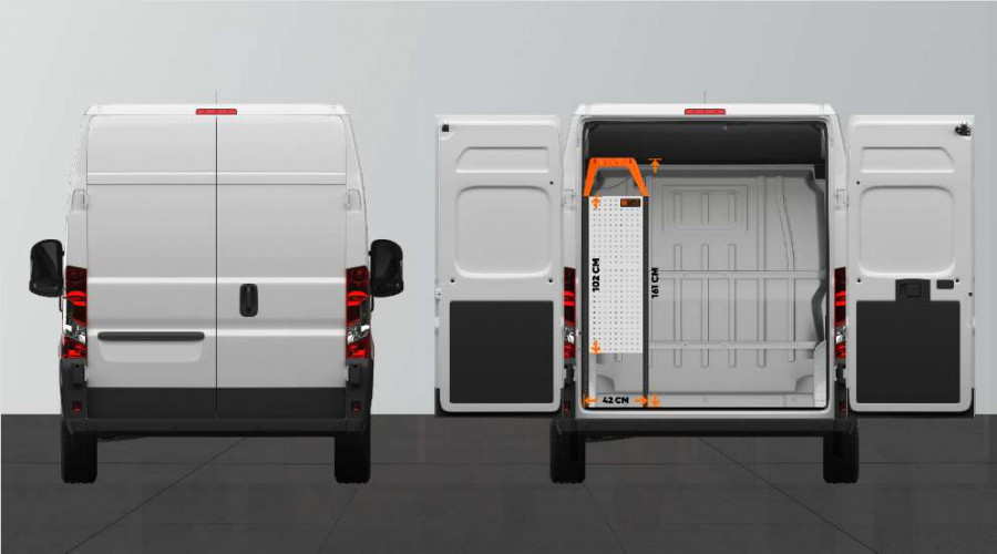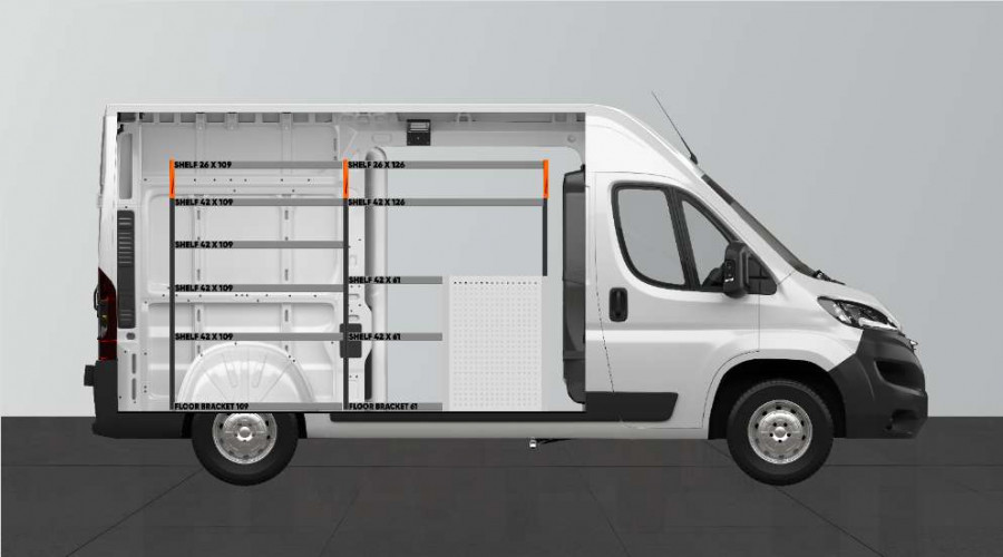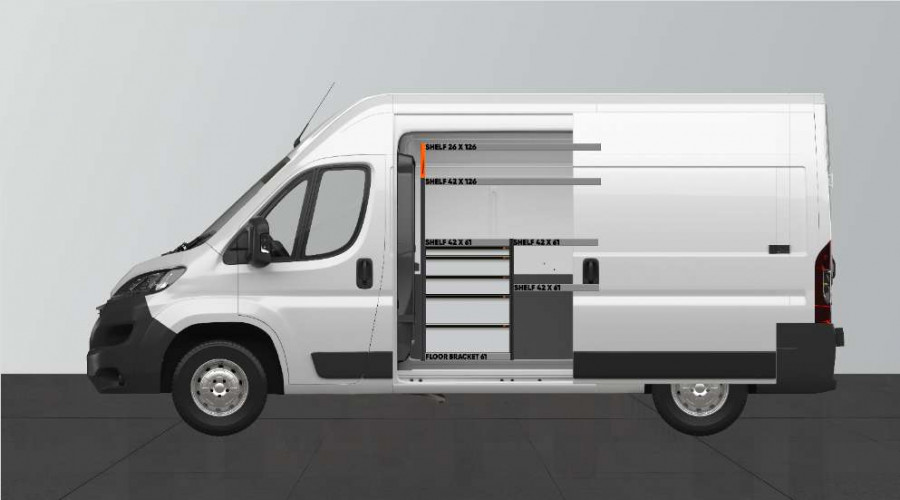 Dette er et av de mest populære systemene for Proace Max, Peugeot Boxer, Fiat Ducato, Citroen Jumper 2010- & Opel Movano 2021- L2 med sidedør på siden av innredningen. Innredningen gir gode oppbevaringsmuligheter for både verktøykofferter, maskiner og et mindre sortiment. Du får en skuffeseksjon med 5 stk. skuffer i ulike størrelser, slik at hver ting har sin plass. Bak skuffene er det en verktøytavle for ekstra opphengsmuligheter i bilen. Skuffene på kulelagerskinner kompletteres ofte med våre nye skuffeinnsatser og avdelere for å skape best mulig oversikt. Det er også populært å komplettere gavlen med vår smartboks for å maksimere oppbevaringsplassen.