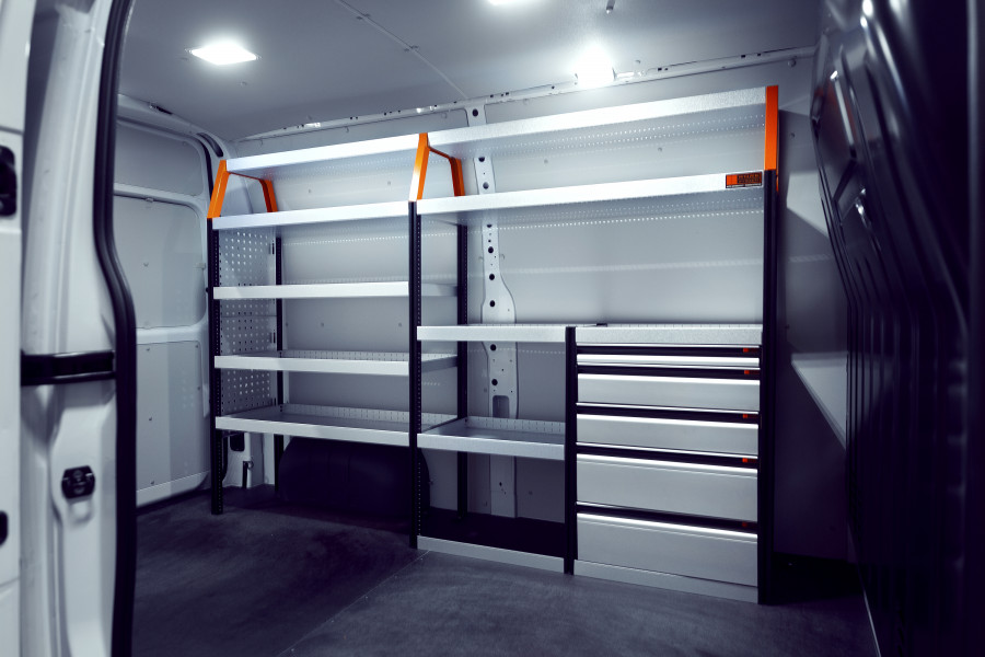 Dette er et av de mest populære systemene for Proace Max, Peugeot Boxer, Fiat Ducato, Citroen Jumper 2010- & Opel Movano 2021- L2. Innredningen gir gode oppbevaringsmuligheter for både verktøykofferter, maskiner og et mindre sortiment. Du får en skuffeseksjon med 5 skuffer i ulike størrelser, slik at hver ting har sin plass. Skuffene på kulelagerskinner kompletteres ofte med våre nye skuffeinnsatser og avdelere for å skape best mulig oversikt. Det er også populært å komplettere gavlen med våre smartbokser for å maksimere oppbevaringsplassen.