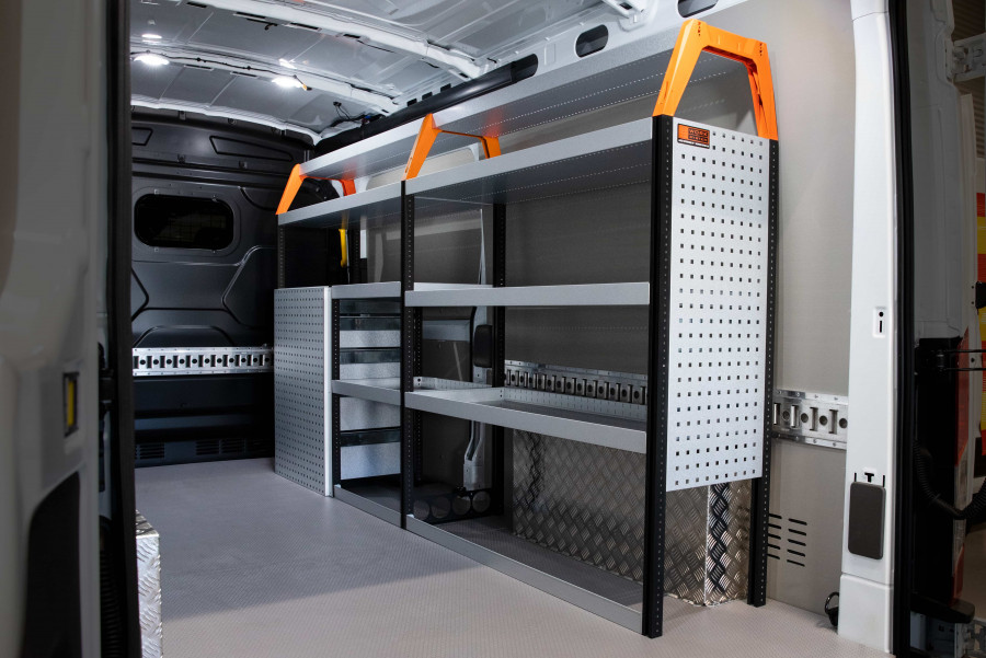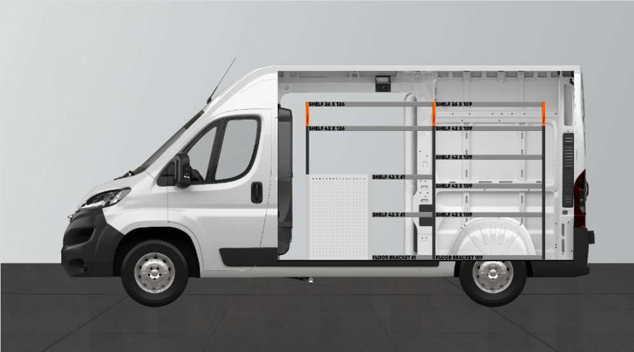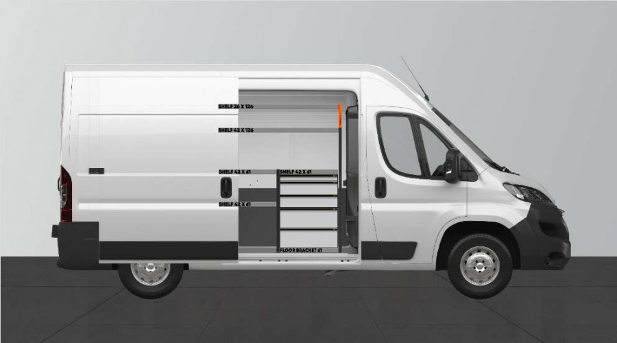 Med denne bilinnredningen får du mye oppbevaring i både hyller og skuffer til Proace Max, Boxer, Ducato, Jumper & Movano L2.