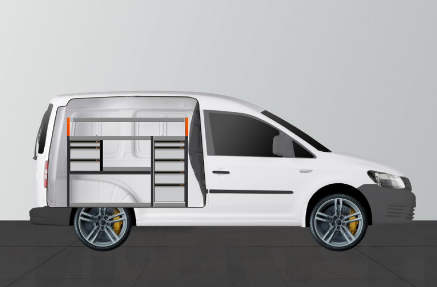 På jakt etter en innredning med mange skuffer? Har du dessuten store krav? Da er dette løsningen for deg og din VW Caddy. Du får totalt 8 stk skuffer på kulelagerskinner. Innredningen gir bra lagringsmuligheter til verktøyesker, verktøy og mindre sortiment. Du får en hurts med skuffer i forskjellige størrelser for å gi hver ting sin plass. Skuffene på kulelagerskinner er populære at komplettere med våre nye skuffeinnsatser for å få struktur. Jevnt fordelt lastvekt i skuffene på kulelagerskinner er 35kg/skuff. Skuffenes indre mål er (mm.): B – 573 & B - 310, D – 387, H - 61, H – 131, samt H – 201.