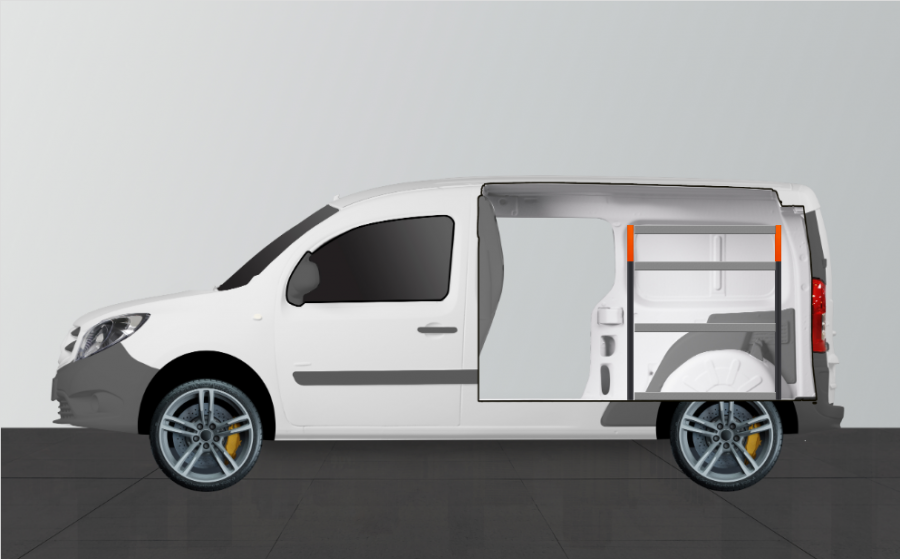 Denne fleksible innredningen til Mercedes Citan Ekstra Lang, Nissan NV250 L2 & Renault Kangoo Maxi gir mange lagringsmuligheter. Komplettere denne innredningen med tilbehør som passer akkurat deg og din bedrift.