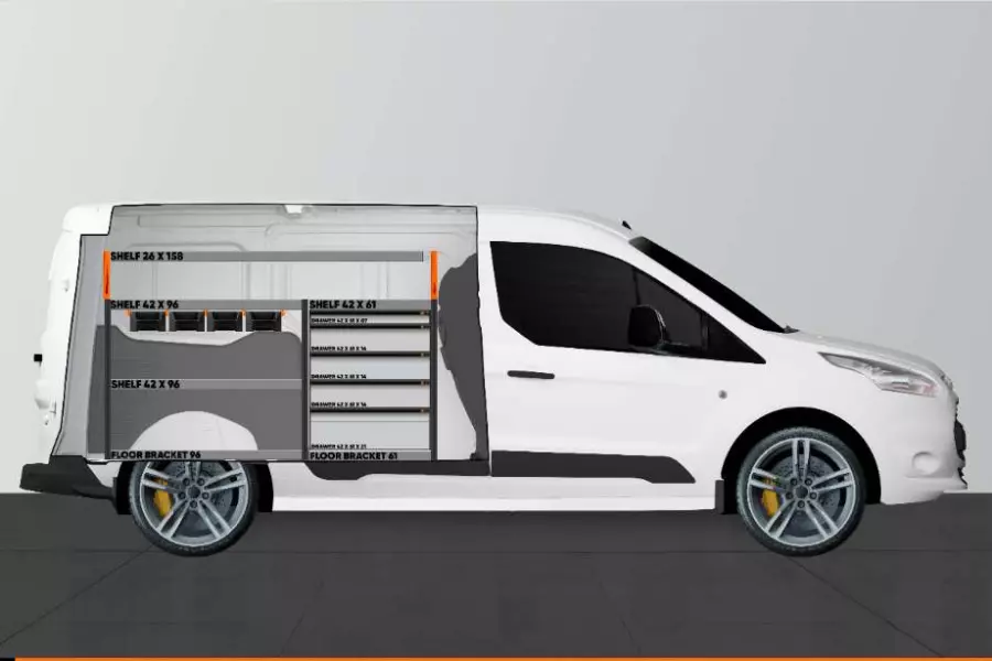 Kjører du en Ford Connect L2? Da er dette en komplett innredning for deg som stiller høye krav. Innredningen gir gode oppbevaringsmuligheter for både verktøykofferter, maskiner og et mindre sortiment. Du får en skuffeseksjon med 5 skuffer i ulike størrelser, slik at hver ting har sin plass. I denne innredningen inngår også 4 av våre modulbokser for å skape orden i et mindre sortiment. Skuffene på kulelagerskinner er populære å komplettere med våre skuffeinnsatser og avdelere for å skape best mulig oversikt.