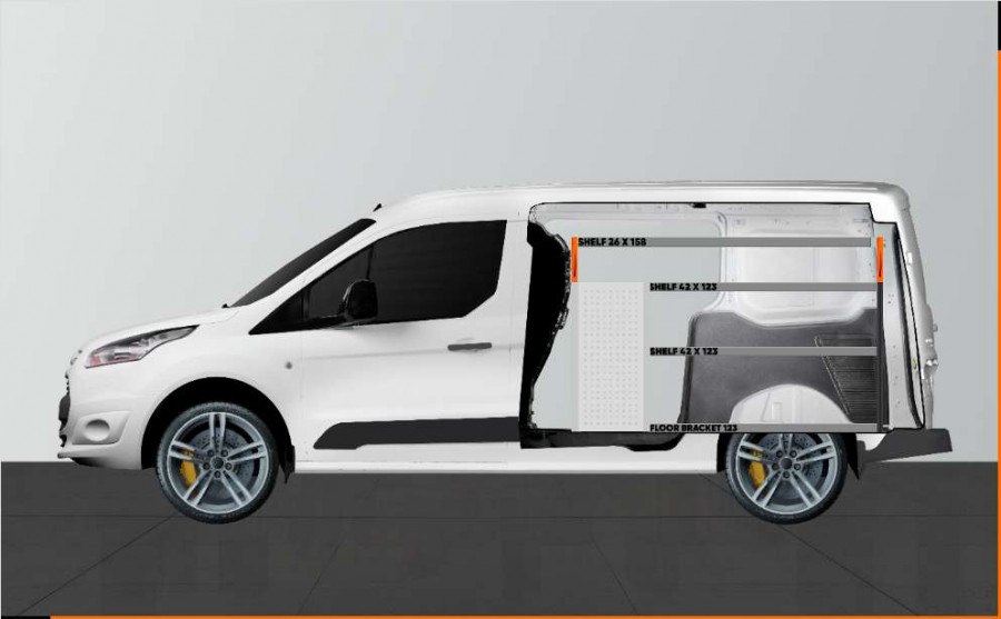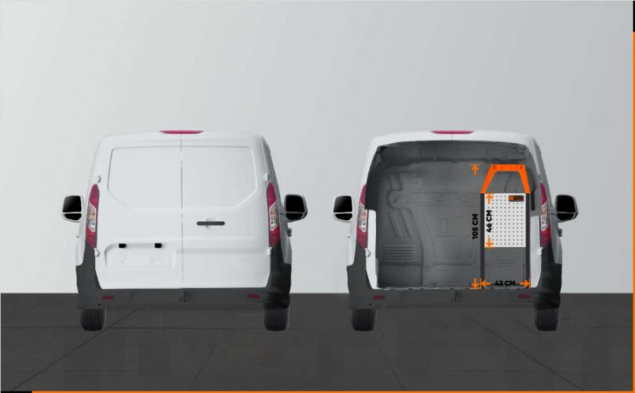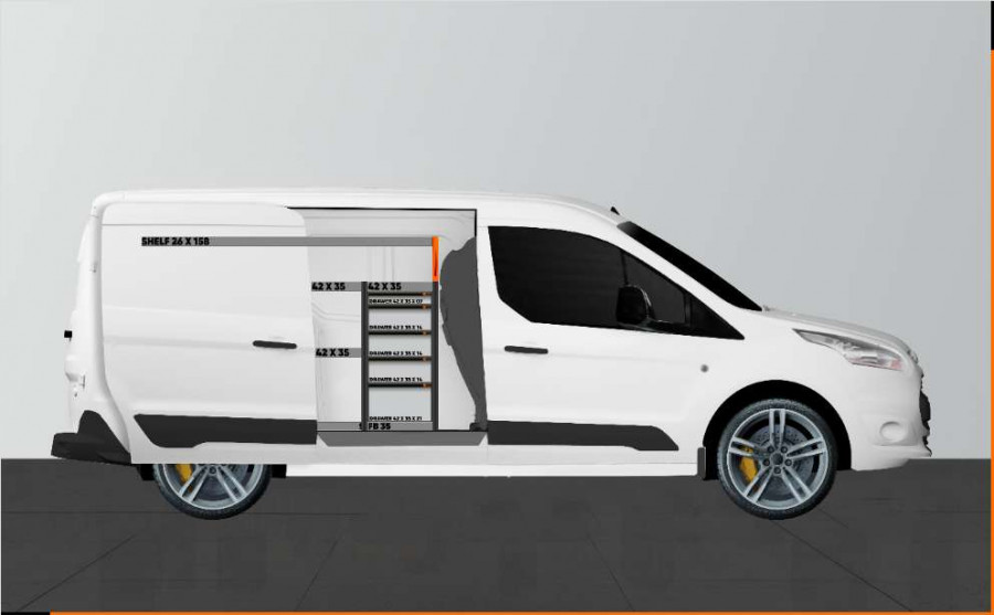 Dette er et av de mest populære systemene for Ford Connect L2 med sidedør på siden av innredningen. Innredningen gir gode oppbevaringsmuligheter for både verktøykofferter, maskiner og et mindre sortiment. Du får en skuffeseksjon med 5 stk. skuffer i ulike størrelser, slik at hver ting har sin plass. Bak skuffene er det en verktøytavle for ekstra opphengsmuligheter i bilen. Skuffene på kulelagerskinner kompletteres ofte med våre nye skuffeinnsatser og avdelere for å skape best mulig oversikt. Det er også populært å komplettere gavlen med vår smartboks for å maksimere oppbevaringsplassen.