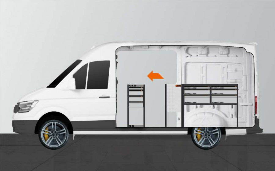 Hvis du trenger en arbeidsbenk i din MAN TGE & Volkswagen Crafter L3, er denne innredningen en fleksibel løsning med skuffer som har plass til mye verktøy og deler. Skuffene er plassert slik at de er lett tilgjengelige både fra sidedøren og under arbeidsbenken. Arbeidsbenken er i 12 mm kompaktlaminat, som er svært hardt og slitesterkt.