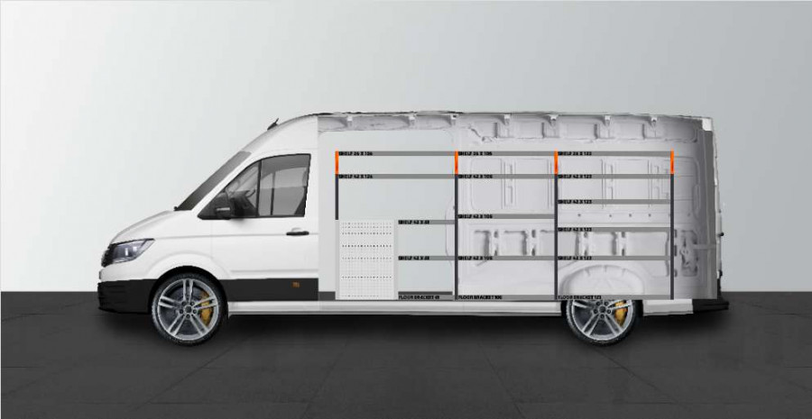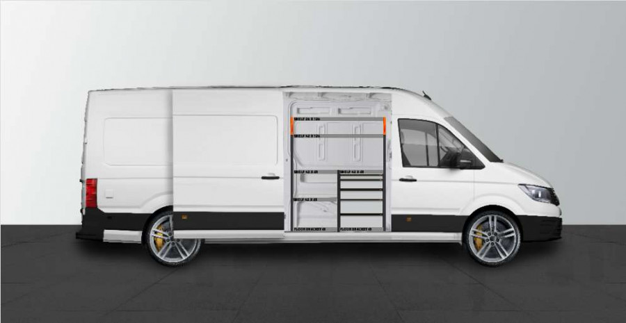 Dette er et av de mest populære systemene for MAN TGE & Volkswagen Crafter L4 med sidedør på siden av innredningen. Innredningen gir gode oppbevaringsmuligheter for både verktøykofferter, maskiner og et mindre sortiment. Du får en skuffeseksjon med 5 stk. skuffer i ulike størrelser, slik at hver ting har sin plass. Bak skuffene er det en verktøytavle for ekstra opphengsmuligheter i bilen. Skuffene på kulelagerskinner kompletteres ofte med våre nye skuffeinnsatser og avdelere for å skape best mulig oversikt. Det er også populært å komplettere gavlen med vår smartboks for å maksimere oppbevaringsplassen.