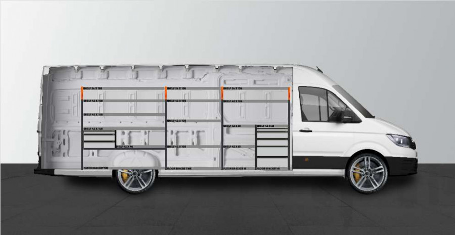 Denne innredningen til MAN TGE & Volkswagen Crafter L5 er for deg som trenger mye fleksibilitet i innredningen. Totalt får du 8 skuffer på kulelagerskinner. Innredningen gir gode oppbevaringsmuligheter for både verktøykofferter, maskiner og et mindre sortiment. Du får en skuffeseksjon med skuffer i ulike størrelser, slik at hver ting har sin plass. Skuffene på kulelagerskinner er populære å komplettere med våre skuffeinnsatser og avdelere for å skape best mulig oversikt i skuffene.