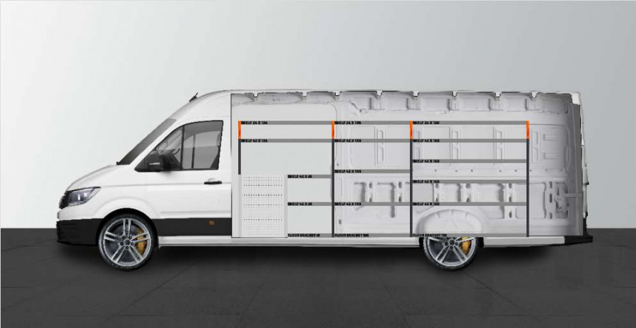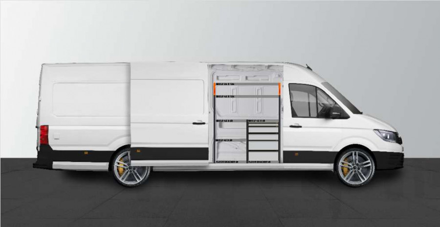 Dette er et av de mest populære systemene for MAN TGE & Volkswagen Crafter L5 med sidedør på siden av innredningen. Innredningen gir gode oppbevaringsmuligheter for både verktøykofferter, maskiner og et mindre sortiment. Du får en skuffeseksjon med 5 stk. skuffer i ulike størrelser, slik at hver ting har sin plass. Bak skuffene er det en verktøytavle for ekstra opphengsmuligheter i bilen. Skuffene på kulelagerskinner kompletteres ofte med våre nye skuffeinnsatser og avdelere for å skape best mulig oversikt. Det er også populært å komplettere gavlen med vår smartboks for å maksimere oppbevaringsplassen.
