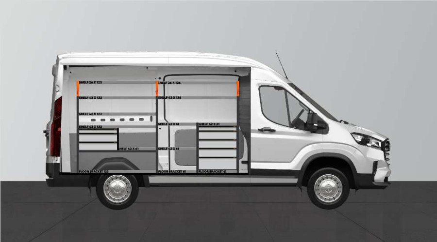 Denne innredningen til Peugeot Boxer, Fiat Ducato & Citroen Jumper L2 er for deg som trenger mye fleksibilitet i innredningen. Totalt får du 8 skuffer på kulelagerskinner. Innredningen gir gode oppbevaringsmuligheter for både verktøykofferter, maskiner og et mindre sortiment. Du får en skuffeseksjon med skuffer i ulike størrelser, slik at hver ting har sin plass. Skuffene på kulelagerskinner er populære å komplettere med våre skuffeinnsatser og avdelere for å skape best mulig oversikt i skuffene.