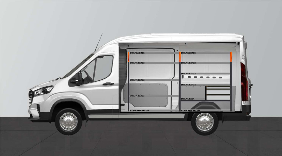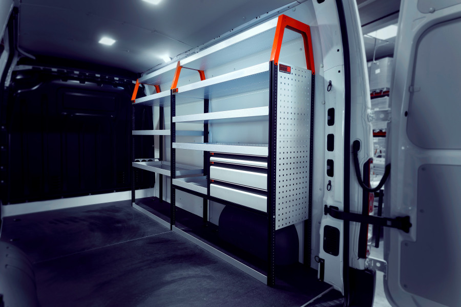 Dette er en av våre mest populære bilinnredninger til Maxus e-Deliver 9 L2. LS3-innredningen brukes av både vaktmestere, serviceteknikere, elektrikere, VVS-medarbeidere og snekkere.Innredningen gir gode oppbevaringsmuligheter for både verktøykofferter, maskiner, forbruksmateriell og de minste sortimentdelene. Skuffene kompletteres ofte med våre skuffeinnsatser og avdelere, mens gavlen er populær å komplettere med vår smartboks for å maksimere oppbevaringsplassen.