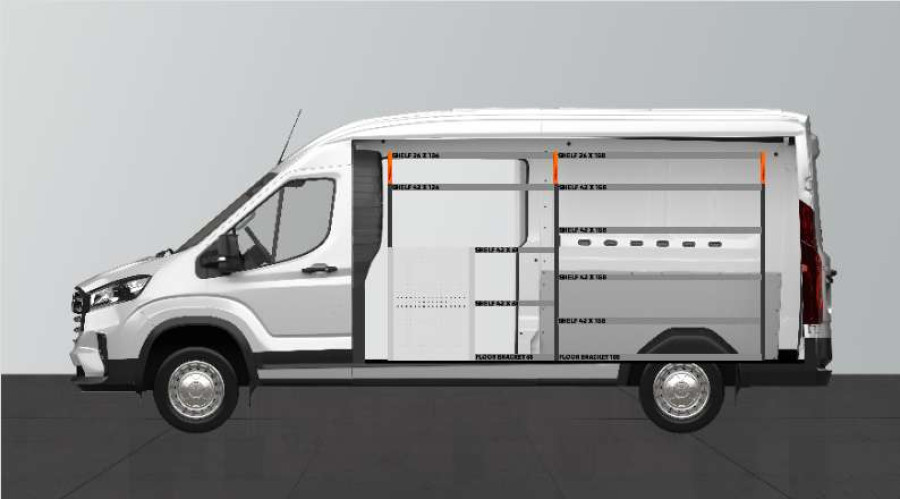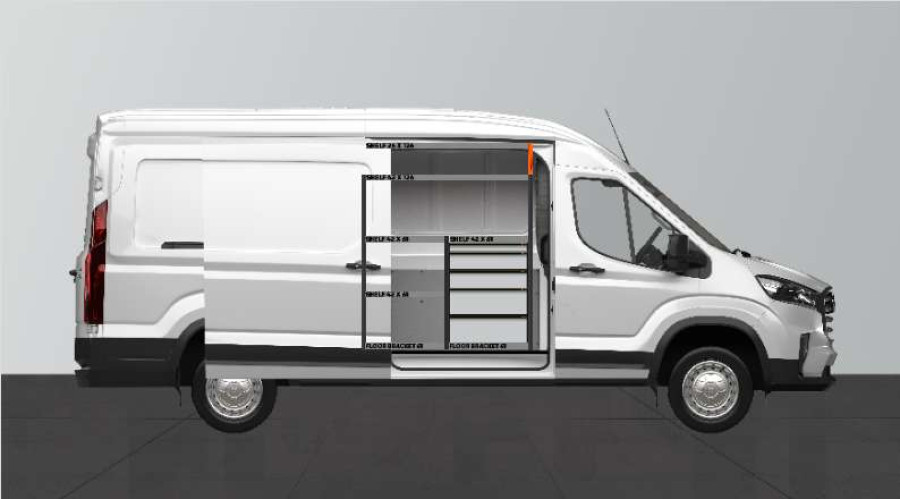 Dette er et av de mest populære systemene for Maxus e-Deliver9 L3 med sidedør på siden av innredningen. Innredningen gir gode oppbevaringsmuligheter for både verktøykofferter, maskiner og et mindre sortiment. Du får en skuffeseksjon med 5 stk. skuffer i ulike størrelser, slik at hver ting har sin plass. Bak skuffene er det en verktøytavle for ekstra opphengsmuligheter i bilen. Skuffene på kulelagerskinner kompletteres ofte med våre nye skuffeinnsatser og avdelere for å skape best mulig oversikt. Det er også populært å komplettere gavlen med vår smartboks for å maksimere oppbevaringsplassen.