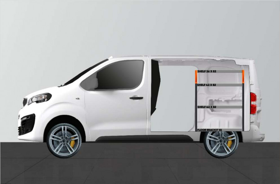 En kortere bilinnredning til din Peugeot Expert, Citroen Jumpy, Opel Vivaro, Fiat Scudo & Toyota ProAce L1, som gir gode oppbevaringsmuligheter for både verktøyvesker og maskiner og et mindre sortiment. Innredningen har hyller med en dybde på 420 mm, som gjør at de fleste verktøykofferter på markedet passer perfekt. Den øverste hyllen på 262,5 mm kompletteres ofte med våre modulbokser for separate plasser til et mindre sortiment. Innredningen passer til biler både med og uten sidedører. Ikke glem å utnytte verktøytavlen på gavlen.