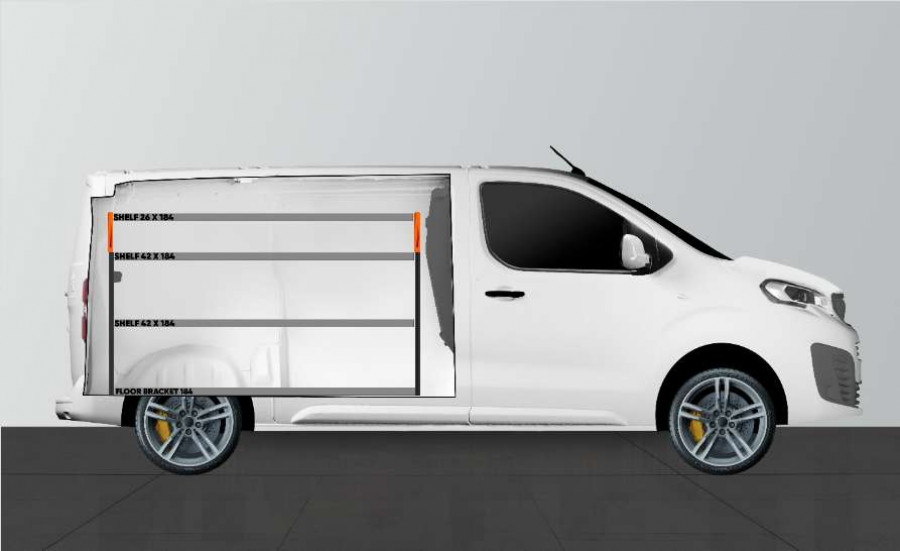 En bilinnredning til din Peugeot Expert, Citroën Jumpy, Opel Vivaro, Fiat Scudo & Toyota ProAce L2 som gir gode oppbevaringsalternativer for både verktøyvesker og maskiner og et mindre sortiment. Innredningens hyller med en dybde på 420 mm gjør at de fleste verktøykofferter på markedet passer perfekt. Den øverste hyllen på 262,5 mm kompletteres ofte med våre modulbokser for å gi plass til et mindre sortiment. Husk å utnytte verktøytavlen på gavlen.