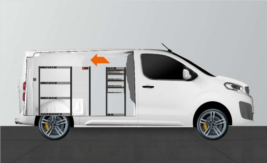 Dette er en av de mest populære innredningene til Peugeot Expert, Citroën Jumpy, Opel Vivaro, Fiat Scudo & Toyota ProAce L2. Innredningen gir varierende oppbevaringsmuligheter ettersom skuffene på kulelagerskinnene gir smidig tilgang via sidedøren, samtidig som skuffene kan trekkes ut i kjøreretningen for å få god oversikt. Disse kan kompletteres med skuffeinndelere for å maksimere strukturen i et mindre sortiment. Mange dype hyller gir også gode oppbevaringsmuligheter for både verktøykofferter og mindre maskiner. Fordelt lastvekt i skuffene på kulelagerskinner er 35 kg/stk. Skuffenes innvendige mål er (mm) B 308, D 387, H 60 og H 130.