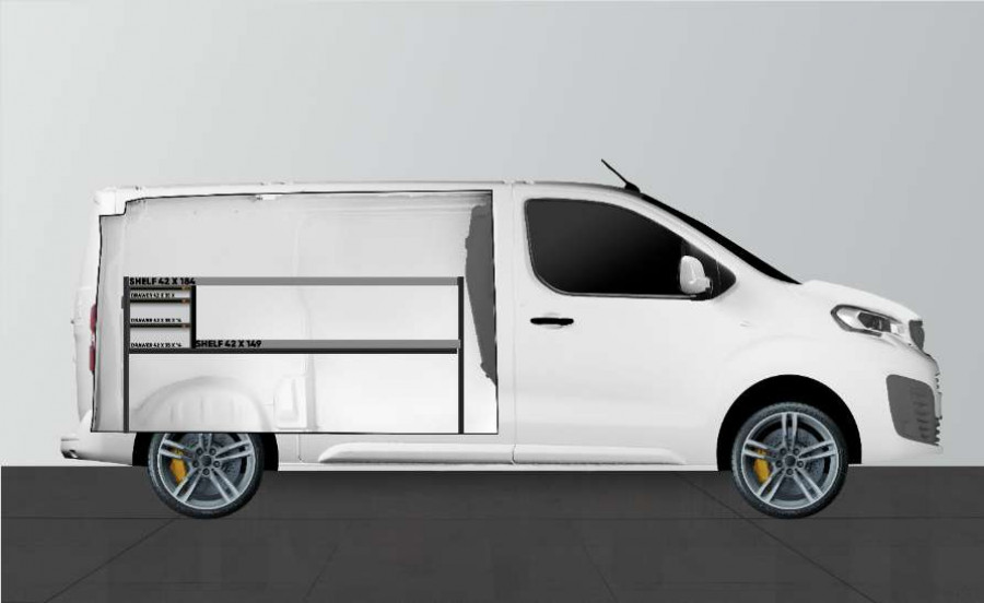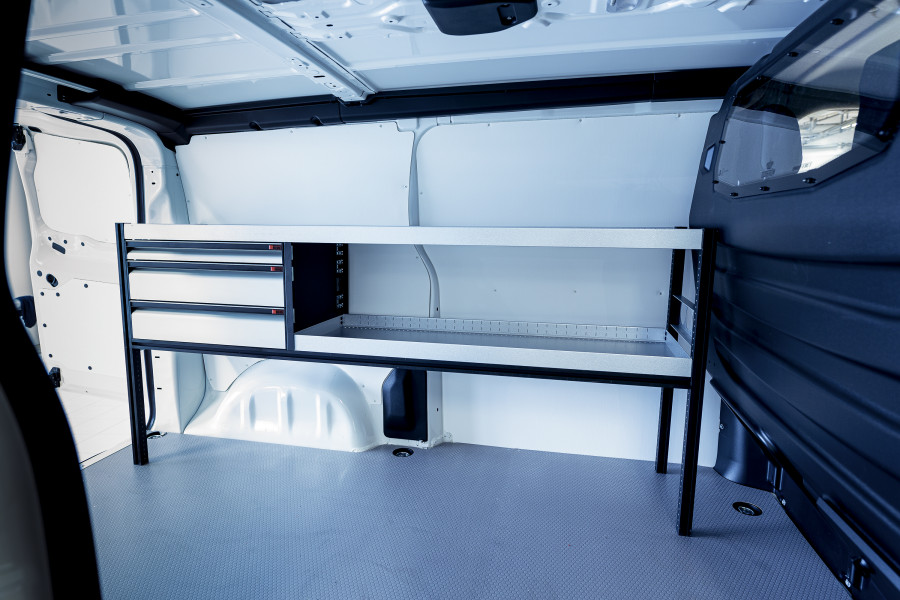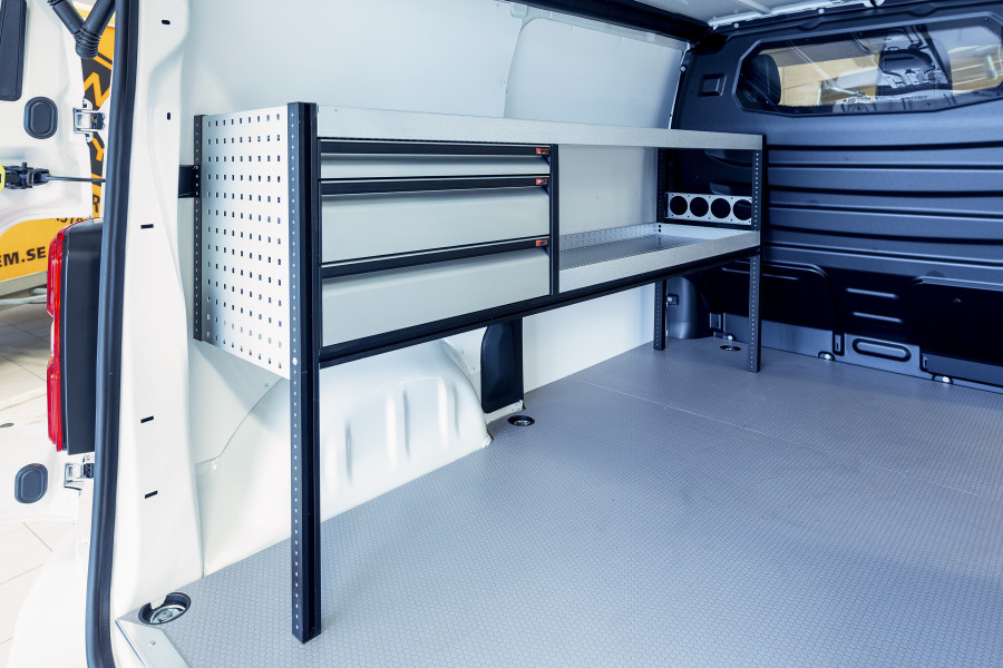 Et priseffektivt alternativ for deg som har et enklere behov for oppbevaring og vil ha en kombinasjon av skuffer på kulelagerskinner, men også hyller til din Peugeot Expert, Citroën Jumpy, Opel Vivaro, Fiat Scudo & Toyota ProAce L2. Innredningen er 420 mm dyp, noe som gjør at de fleste verktøykofferter på markedet passer perfekt. Skuffene er populære å komplettere med våre skuffeinnsatser og avdelere, noe som gir gode muligheter til å skape orden i et mindre sortiment.