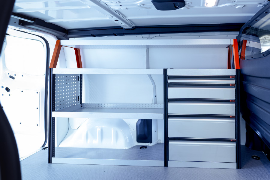 Dette er et av de mest populære systemene for Peugeot Expert, Citroën Jumpy, Opel Vivaro, Fiat Scudo & Toyota ProAce L2. Innredningen gir gode oppbevaringsmuligheter for både verktøykofferter, maskiner og et mindre sortiment. Du får en skuffeseksjon med 5 skuffer i ulike størrelser, slik at hver ting har sin plass. Skuffene på kulelagerskinner kompletteres ofte med våre nye skuffeinnsatser og avdelere for å skape best mulig oversikt. Det er også populært å komplettere gavlen med våre smartbokser for å maksimere oppbevaringsplassen.