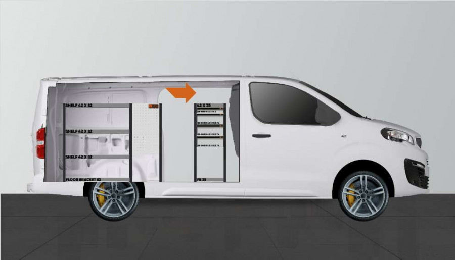 Dette er en av de mest populære innredningene til Peugeot Expert, Citroen Jumpy, Opel Vivaro, Fiat Scudo & Toyota ProAce. Innredningen gir varierende oppbevaringsmuligheter ettersom skuffene på kulelagerskinnene gir smidig tilgang via sidedøren, samtidig som skuffene kan trekkes ut i kjøreretningen for å få god oversikt. Disse kan kompletteres med skuffeinndelere for å maksimere strukturen i et mindre sortiment. Mange dype hyller gir også gode oppbevaringsmuligheter for både verktøykofferter og mindre maskiner. Fordelt lastvekt i skuffene på kulelagerskinner er 35 kg/stk. Skuffenes innvendige mål er (mm) B 308, D 387, H 60 og H 130.