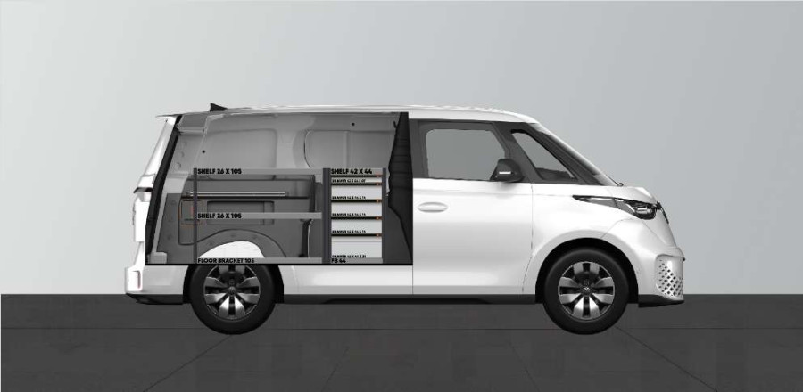 Dette er et av de mest populære systemene for VOLKSWAGEN ID BUZZ L1. Innredningen gir gode oppbevaringsmuligheter for både verktøykofferter, maskiner og et mindre sortiment. Du får en skuffeseksjon med 5 skuffer i ulike størrelser, slik at hver ting har sin plass. Skuffene på kulelagerskinner kompletteres ofte med våre nye skuffeinnsatser og avdelere for å skape best mulig oversikt. Det er også populært å komplettere gavlen med våre smartbokser for å maksimere oppbevaringsplassen.