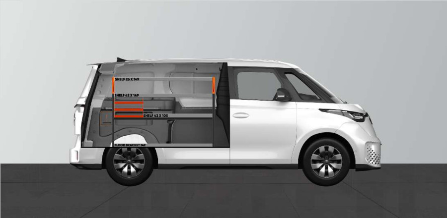 En populær innredning for deg som trenger gode oppbevaringsmuligheter til et mindre sortiment, verktøykofferter og maskiner. Denne serviceinnredningen inneholder 3 stk. sortimentholdere som er tilpasset markedets mest populære sortimentskuff, Racco Carrylight. Innredningen kan om ønskelig kompletteres med disse sortimentskuffene. Bilinnredningen passer perfekt til din Volkswagen ID Buzz L1.