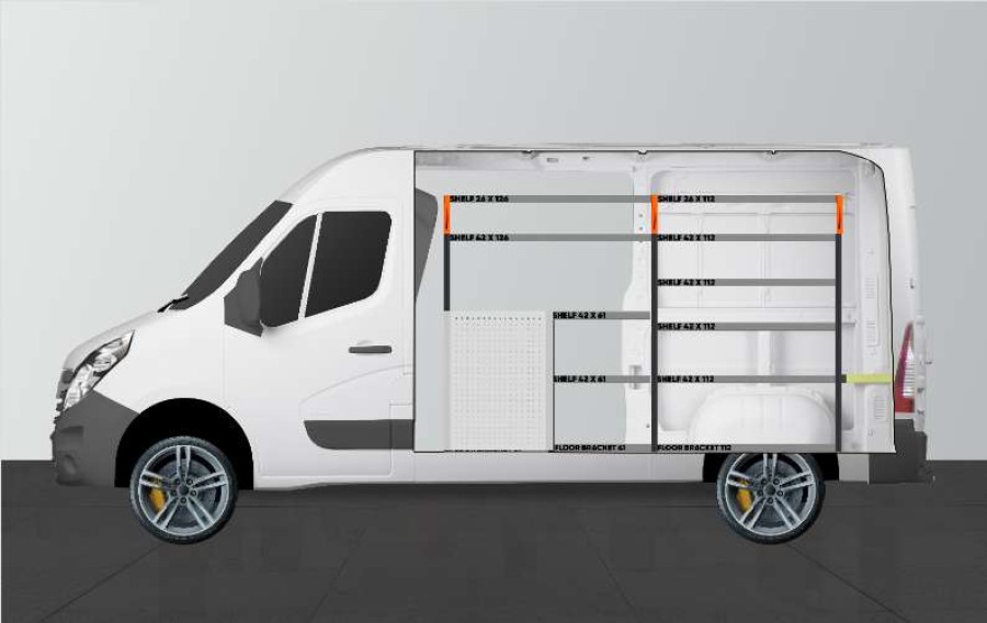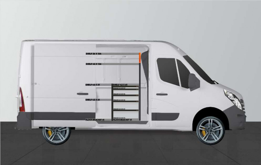 Dette er et av de mest populære systemene for Opel Movano, Renualt Master & Nissan NV400 med sidedør på siden av innredningen. Innredningen gir gode oppbevaringsmuligheter for både verktøykofferter, maskiner og et mindre sortiment. Du får en skuffeseksjon med 5 stk. skuffer i ulike størrelser, slik at hver ting har sin plass. Bak skuffene er det en verktøytavle for ekstra opphengsmuligheter i bilen. Skuffene på kulelagerskinner kompletteres ofte med våre nye skuffeinnsatser og avdelere for å skape best mulig oversikt. Det er også populært å komplettere gavlen med vår smartboks for å maksimere oppbevaringsplassen.