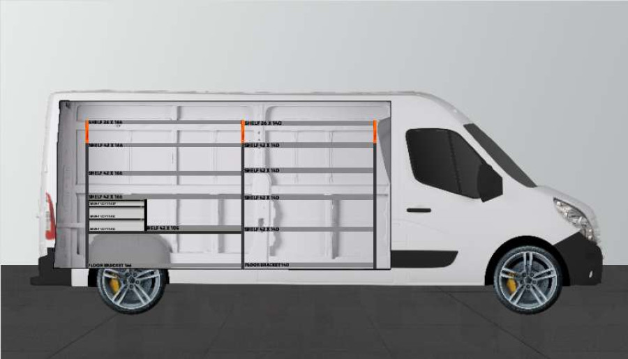 Dette er en av våre mest populære bilinnredninger til Opel Movano, Renault Master & Nissan NV400 L3. LS3-innredningen brukes av både vaktmestere, serviceteknikere, elektrikere, VVS-medarbeidere og snekkere.Innredningen gir gode oppbevaringsmuligheter for både verktøykofferter, maskiner, forbruksmateriell og de minste sortimentdelene. Skuffene kompletteres ofte med våre skuffeinnsatser og avdelere, mens gavlen er populær å komplettere med vår smartboks for å maksimere oppbevaringsplassen.