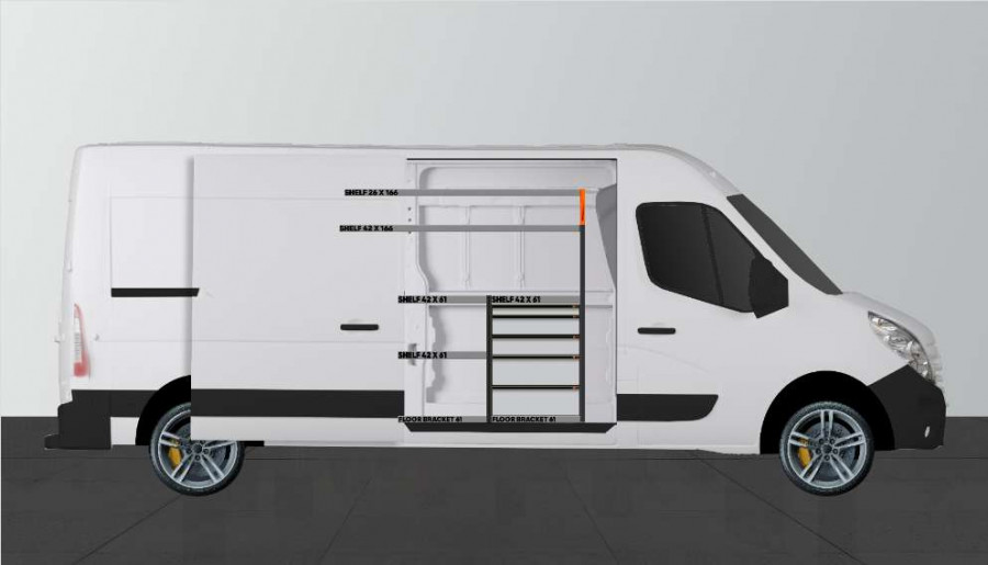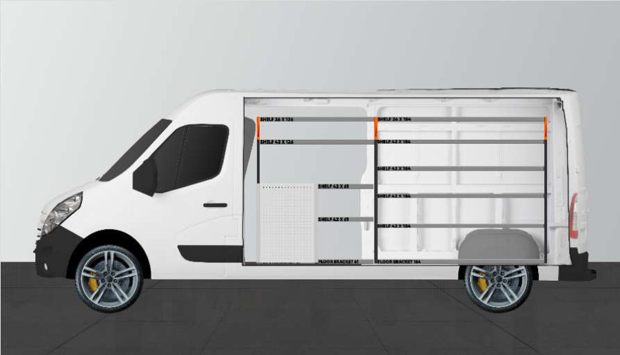 Dette er et av de mest populære systemene for Opel Movano, Renault Master & Nissan NV400 L3 med sidedør på siden av innredningen. Innredningen gir gode oppbevaringsmuligheter for både verktøykofferter, maskiner og et mindre sortiment. Du får en skuffeseksjon med 5 stk. skuffer i ulike størrelser, slik at hver ting har sin plass. Bak skuffene er det en verktøytavle for ekstra opphengsmuligheter i bilen. Skuffene på kulelagerskinner kompletteres ofte med våre nye skuffeinnsatser og avdelere for å skape best mulig oversikt. Det er også populært å komplettere gavlen med vår smartboks for å maksimere oppbevaringsplassen.