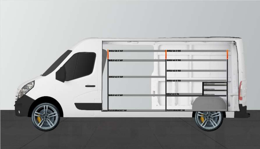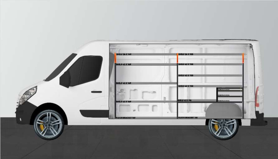 Dette er en av våre mest populære bilinnredninger til Opel Movano, Renault Master & Nissan NV400 L3. LS3-innredningen brukes av både vaktmestere, serviceteknikere, elektrikere, VVS-medarbeidere og snekkere.Innredningen gir gode oppbevaringsmuligheter for både verktøykofferter, maskiner, forbruksmateriell og de minste sortimentdelene. Skuffene kompletteres ofte med våre skuffeinnsatser og avdelere, mens gavlen er populær å komplettere med vår smartboks for å maksimere oppbevaringsplassen.