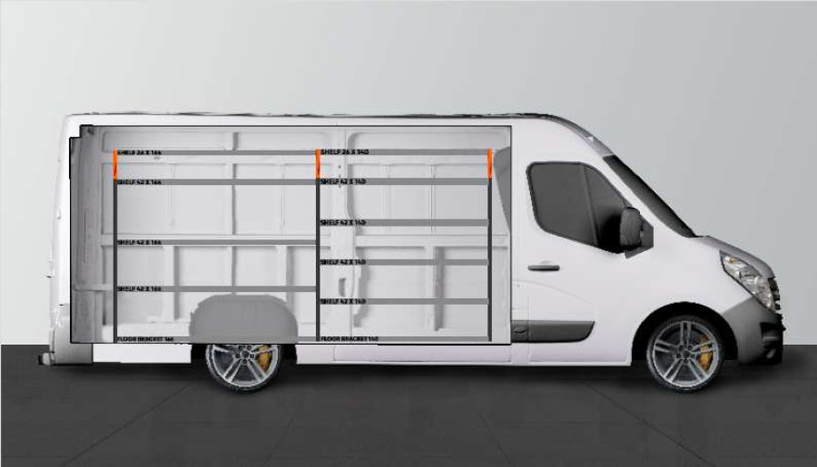 En bilinnredning til din Opel Movano, Renault Master & Nissan NV400 som gir gode oppbevaringsalternativer for både verktøyvesker og maskiner og et mindre sortiment. Innredningens hyller med en dybde på 420 mm gjør at de fleste verktøykofferter på markedet passer perfekt. Den øverste hyllen på 262,5 mm kompletteres ofte med våre modulbokser for å gi plass til et mindre sortiment. Husk å utnytte verktøytavlen på gavlen.