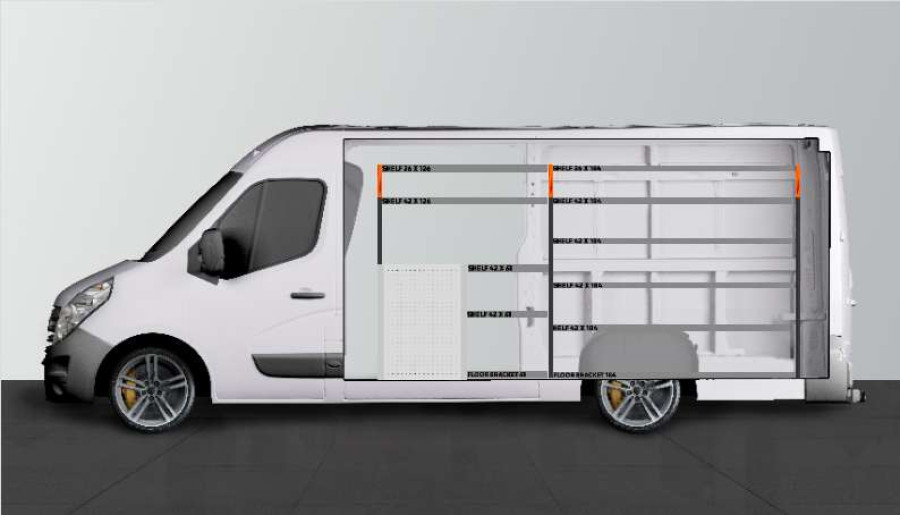 Dette er et av de mest populære systemene for Opel Movano, Renault Master & Nissan NV400 L3 med sidedør på siden av innredningen. Innredningen gir gode oppbevaringsmuligheter for både verktøykofferter, maskiner og et mindre sortiment. Du får en skuffeseksjon med 5 stk. skuffer i ulike størrelser, slik at hver ting har sin plass. Bak skuffene er det en verktøytavle for ekstra opphengsmuligheter i bilen. Skuffene på kulelagerskinner kompletteres ofte med våre nye skuffeinnsatser og avdelere for å skape best mulig oversikt. Det er også populært å komplettere gavlen med vår smartboks for å maksimere oppbevaringsplassen.