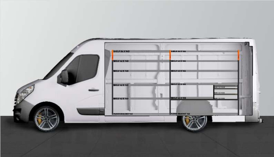 Dette er en av våre mest populære bilinnredninger til Opel Movano, Renault Master & Nissan NV400 L3. LS3-innredningen brukes av både vaktmestere, serviceteknikere, elektrikere, VVS-medarbeidere og snekkere.Innredningen gir gode oppbevaringsmuligheter for både verktøykofferter, maskiner, forbruksmateriell og de minste sortimentdelene. Skuffene kompletteres ofte med våre skuffeinnsatser og avdelere, mens gavlen er populær å komplettere med vår smartboks for å maksimere oppbevaringsplassen.