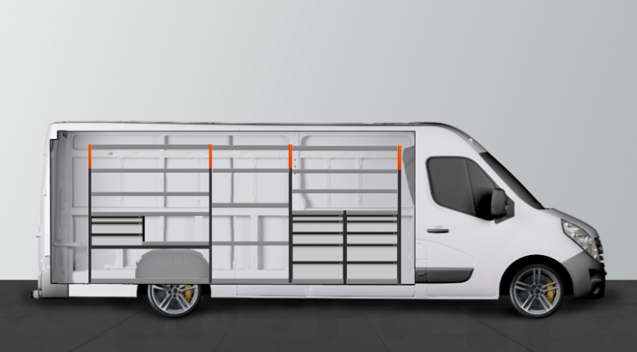 På jakt etter en innredning med mange skuffer? Da er dette løsningen for deg og din Opel Movano, Renault Master eller Nissan NV400. Du får totalt 13 stk skuffer på kulelagerskinner. Innredningen gir bra lagringsmuligheter til verktøyesker, verktøy og mindre sortiment. Du får tre hurtser med skuffer i forskjellige størrelser for å gi hver ting sin plass. Skuffene på kulelagerskinner er populære å komplettere med våre nye skuffeinndelere for å få struktur. Jevnt fordelt lastvekt i skuffene på kulelagerskinner er 35kg/skuff. Skuffenes indre mål er (mm.): D - 387, B - 573, H - 201, H - 131 og H - 61.