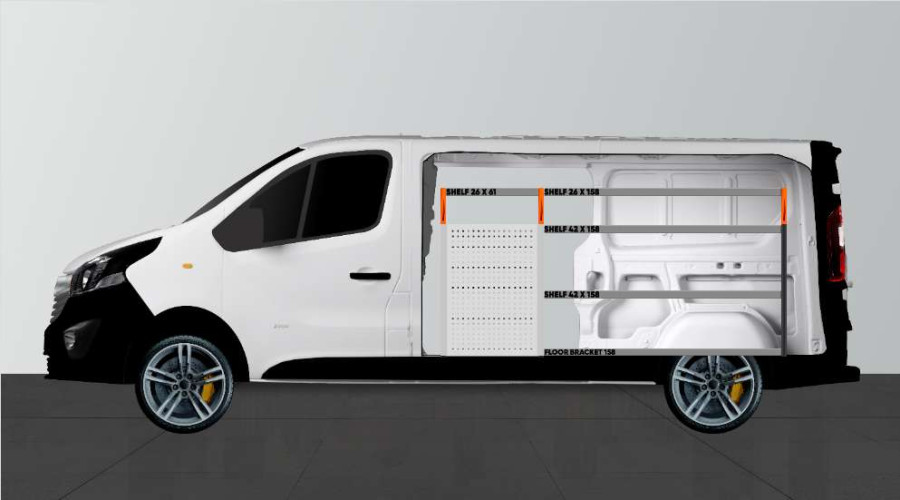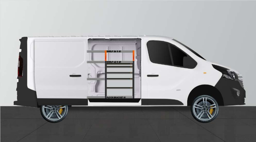 Dette er et av de mest populære systemene for Nissan NV300, Renault Trafic & Fiat Talento L2 med sidedør på siden av innredningen. Innredningen gir gode oppbevaringsmuligheter for både verktøykofferter, maskiner og et mindre sortiment. Du får en skuffeseksjon med 5 stk. skuffer i ulike størrelser, slik at hver ting har sin plass. Bak skuffene er det en verktøytavle for ekstra opphengsmuligheter i bilen. Skuffene på kulelagerskinner kompletteres ofte med våre nye skuffeinnsatser og avdelere for å skape best mulig oversikt. Det er også populært å komplettere gavlen med vår smartboks for å maksimere oppbevaringsplassen.