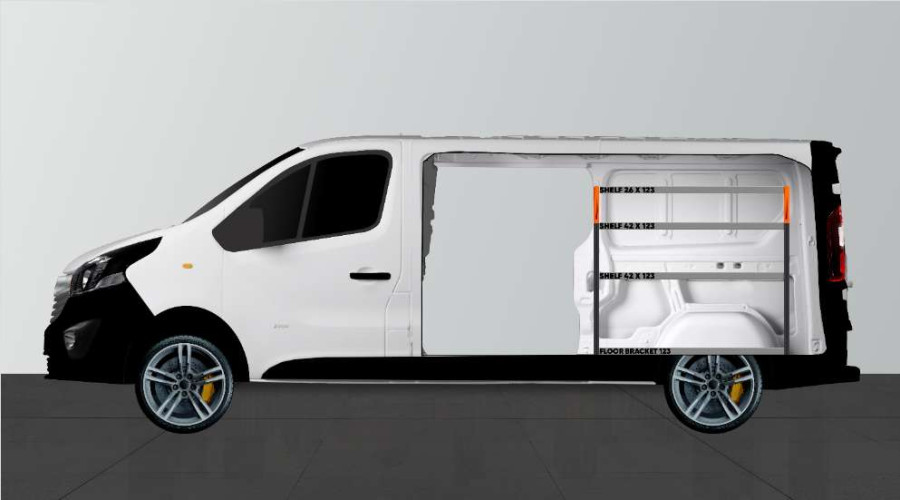En kortere bilinnredning til din FIAT Talento, Nissan NV300 & Renault Trafic L2, som gir gode oppbevaringsmuligheter for både verktøyvesker og maskiner og et mindre sortiment. Innredningen har hyller med en dybde på 420 mm, som gjør at de fleste verktøykofferter på markedet passer perfekt. Den øverste hyllen på 262,5 mm kompletteres ofte med våre modulbokser for separate plasser til et mindre sortiment. Innredningen passer til biler både med og uten sidedører. Ikke glem å utnytte verktøytavlen på gavlen.