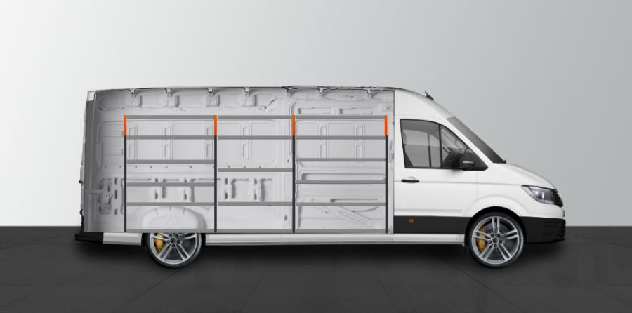 En bilinnredning til din Mercedes Sprinter Lang som gir gode lagringsmuligheter for verktøyesker, verktøy og mindre sortiment. Innredningen har hylleplan med en dybde på 420mm, hvilket gjør at de fleste av markedets verktøyesker passer perfekt. Topphyllen med en dybde på 262,5mm er vanlig å komplettere med våre nye modulbokser for å få plass til mindre sortiment. Ikke glem å dra nytte av verktøytavlen på endeplaten.