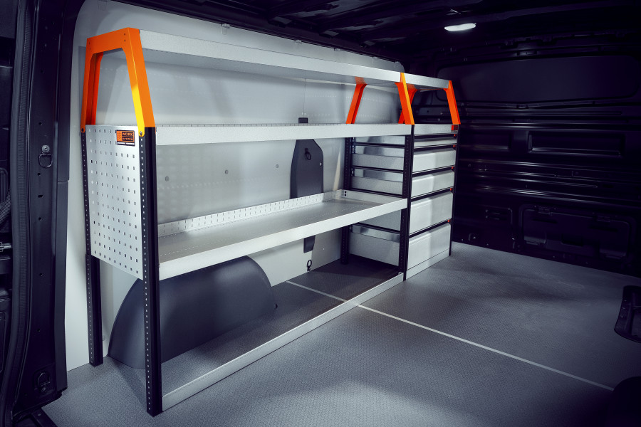 Dette er ett av de mest populære systemen til VW Transporter. Innredningen gir deg gode lagringsmuligheter til verktøyesker, verktøy og mindre sortiment. Du får en hurts med 5stk. skuffer i forskjellige størrelser for å gi hver ting sin plass. Skuffene med kulelagerskinner er populære at komplettere med våre nye skuffeinnsatser for å få bra struktur. Å komplettere gavlen med vår nye smartboks pleier også være ett populært alternativ for å maksimere lagringsplassen. Jevnt fordelt lastvekt i skuffene på kulelagerskinner er 35kg/skuff. Skuffenes indre mål er (mm.): B – 5793 D – 387, H – 61, H – 131 samt H – 201.