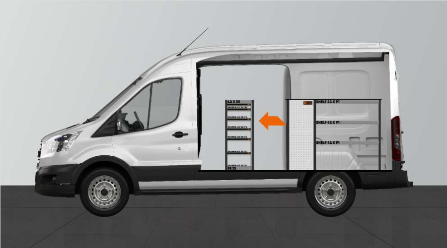 Hvis du trenger en arbeidsbenk i din VEHICLEMODEL2, er denne innredningen en fleksibel kombinasjon av hylleoppbevaring og uttrekkbare skuffer som er lett tilgjengelige fra bilens sidedør. Arbeidsbenken er i 12 mm kompaktlaminat, som er svært hardt og slitesterkt.